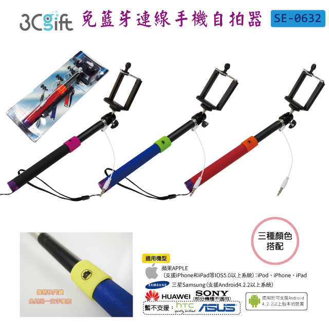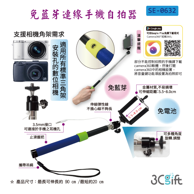 * 6吋以下手機適用,免藍牙對頻、免充電、免裝電池,六段伸縮,